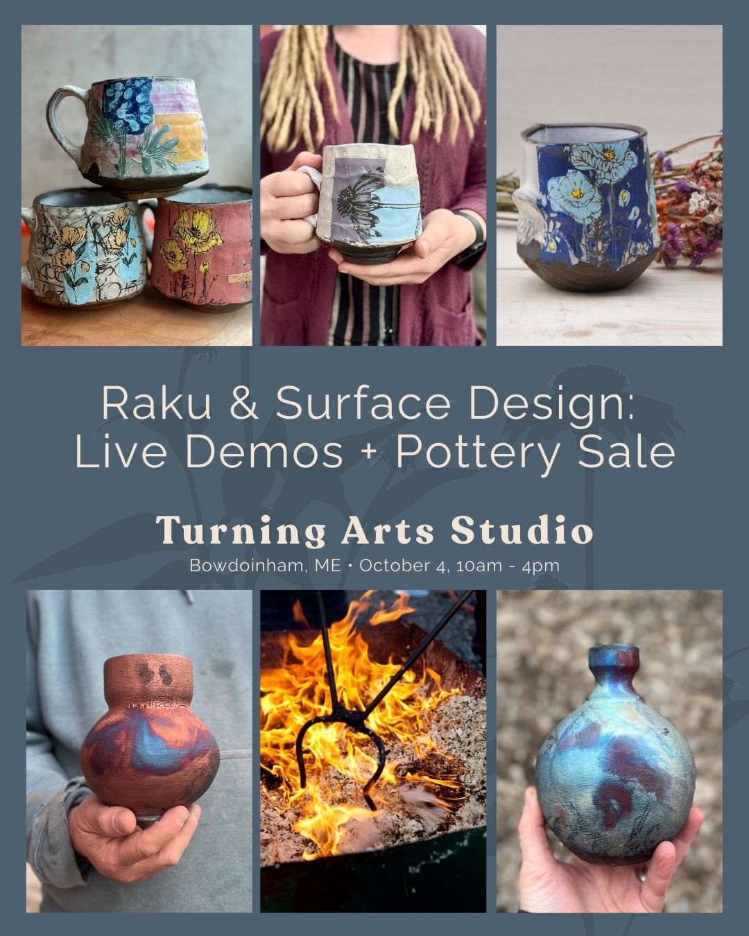 Experience the texture, color, and drama of clay in action. Watch Zachary pull red-hot 2000-degree pottery from the raku kiln and place them into combustibles, sending pots bursting into flames. Janna will demonstrate how she brings clay surfaces to life with layered slips, stencils, and monoprints.