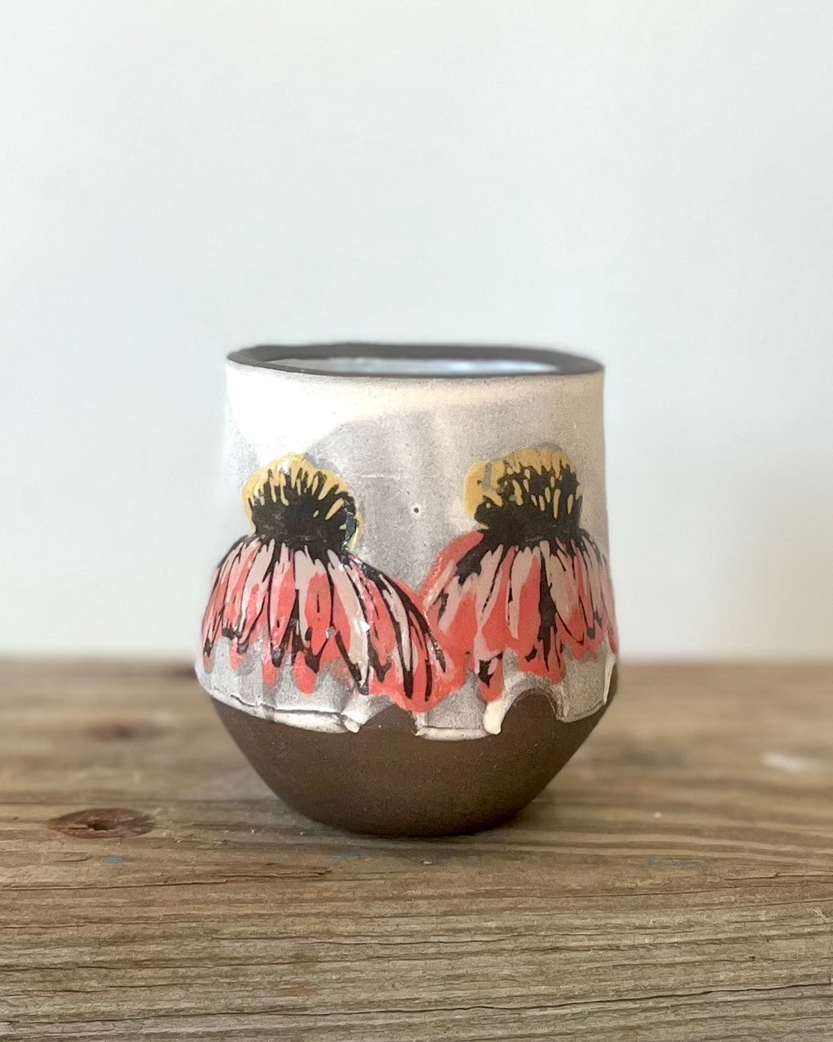 This hand-built stoneware mug was made at Turning Arts Studio in Bowdoinham, Maine. Each mug is decorated by hand, featuring surface designs created with slip, underglaze, stencils, and hand-drawn monoprints. The nub handle is designed for a comfortable grip, making every sip a little more enjoyable.